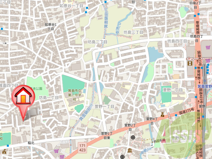 | 交通 | 阪急箕面線/箕面駅 徒歩18分 北大阪急行電鉄/箕面萱野駅駅 徒歩18分 阪急箕面線牧落駅 徒歩18分 |